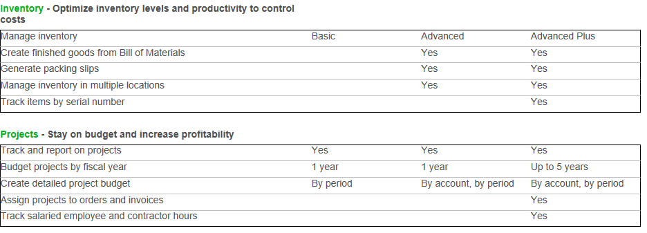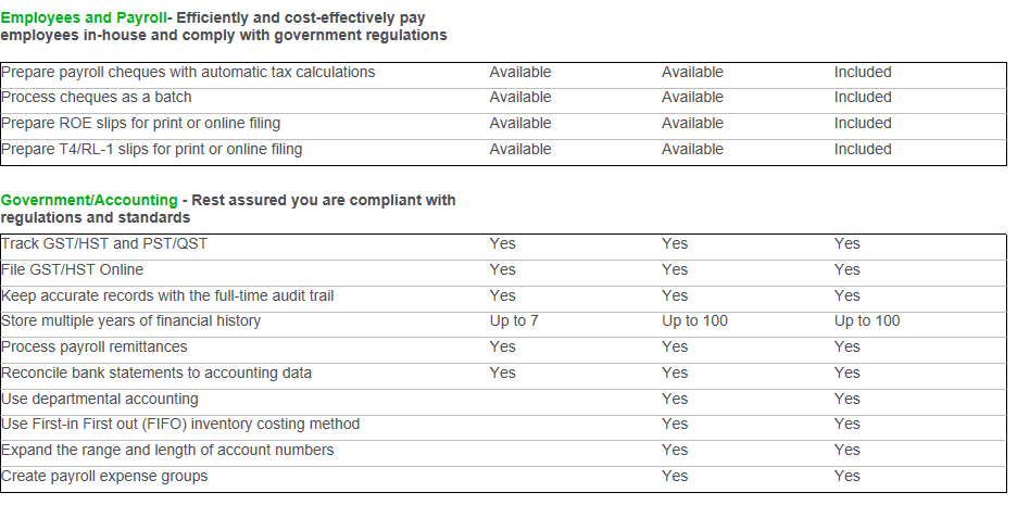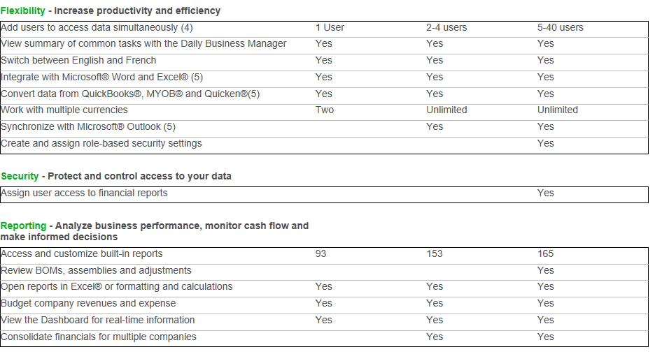 Perbandingan produk Sage 50 Canadian Edition dan ketersediaan fitur